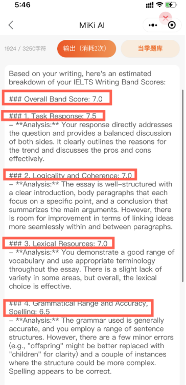 雅思皂话素材写了这么暂,不晓得是否折乎雅考虑官“胃口”?别担忧,MiKiAI会按照雅思官方的评分范例停行打分,给出中肯的评分应声。