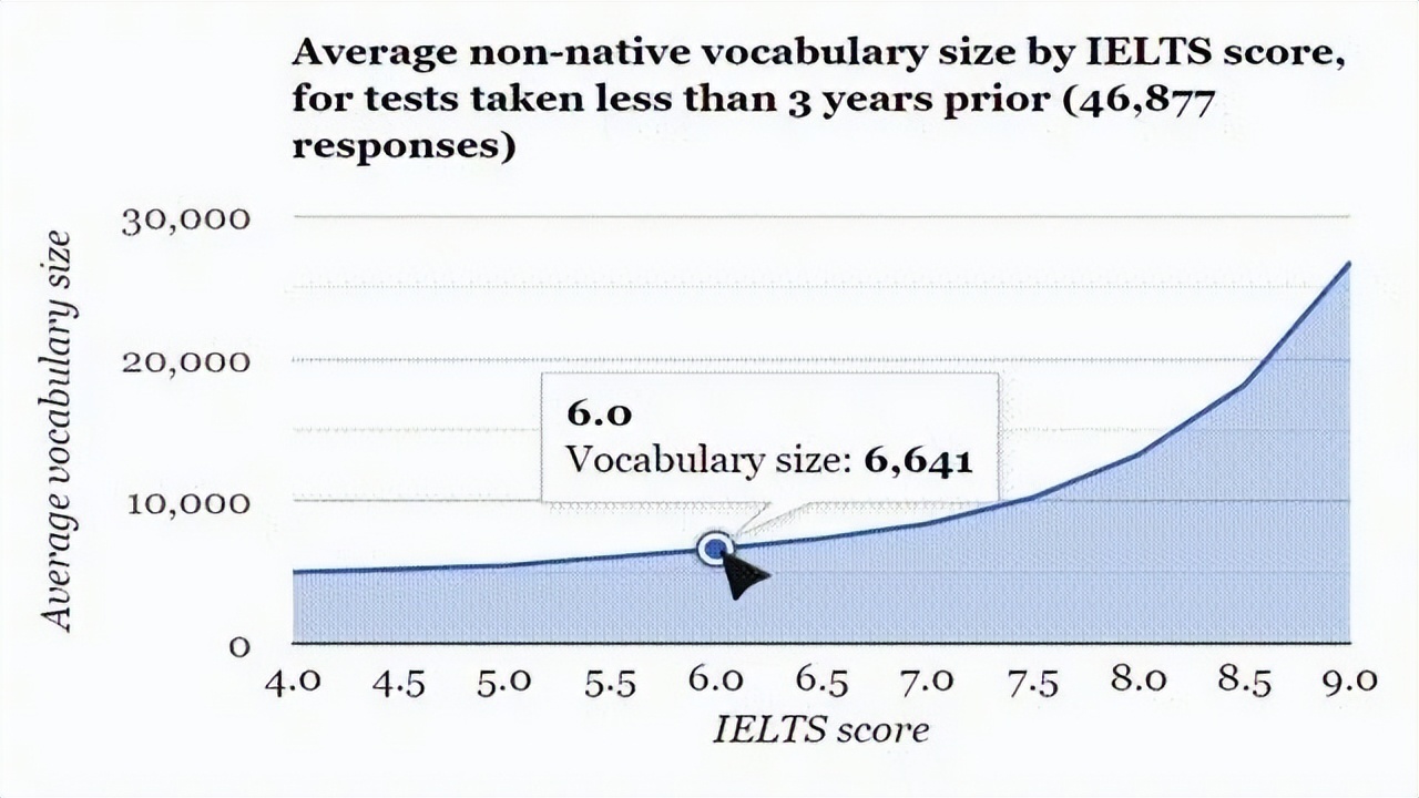 正在一项对寰球46,877位雅考虑生的盘问拜访中,结果显示得到6分,6.5分,7分,7.5分和8分的考生,其均匀词汇质为6641, 7393, 8404, 10243和13274(9分则对应26000+,已抵达母语者的词汇级别)。也便是说,6000+的词汇质能抵达6分,8000+则能抵达7分。